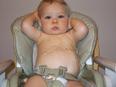 I LOVE the look on his face in the last picture, like "what mom? isn't this spaghetti a good look for me?"Found you through Honey Mommy, but I'm sure I've been here before.